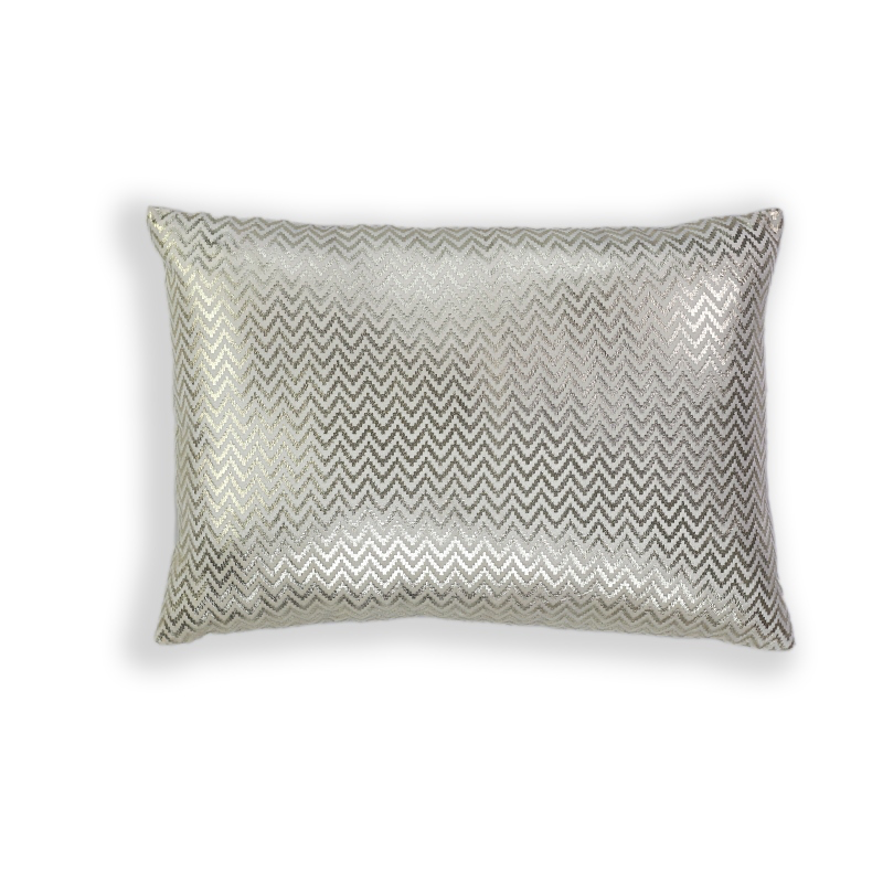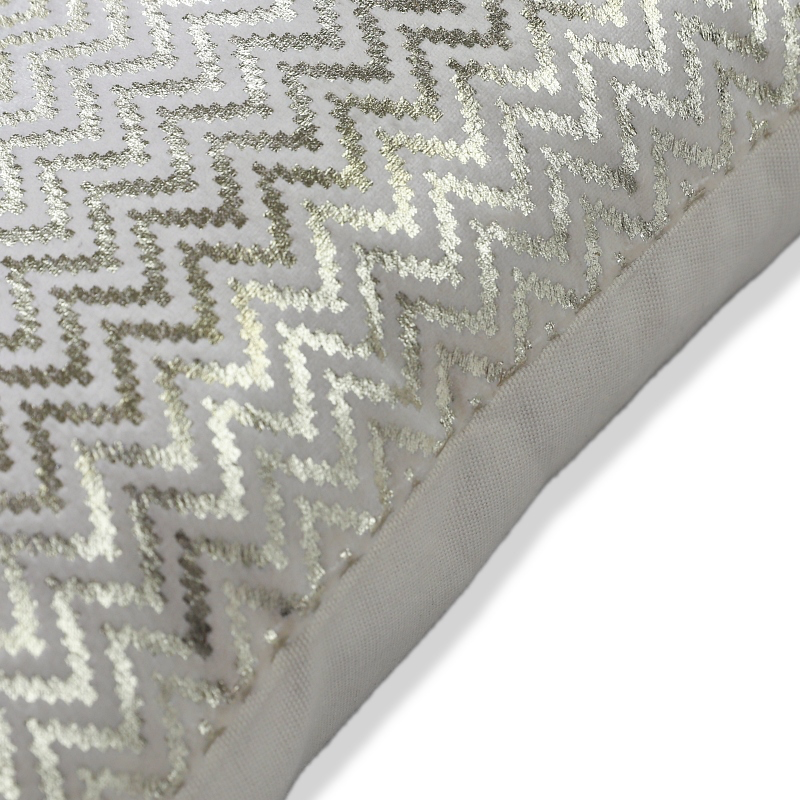Abstract vertical streaks in metallic foil print. Enhanced with hand embroidery / handwork for texture and sparkle. Rich, shimmering look suitable for luxury interiors.